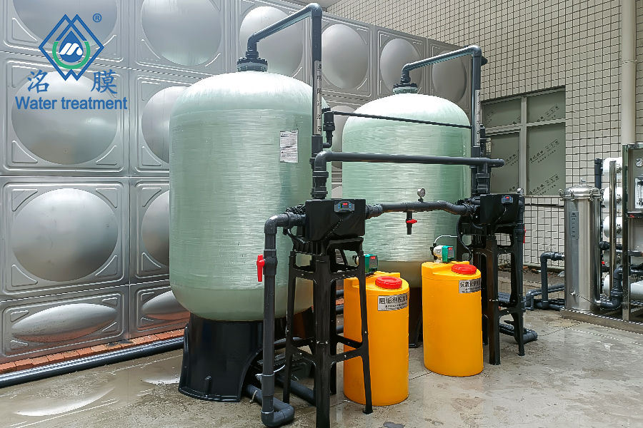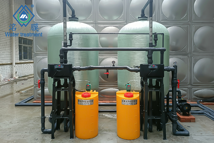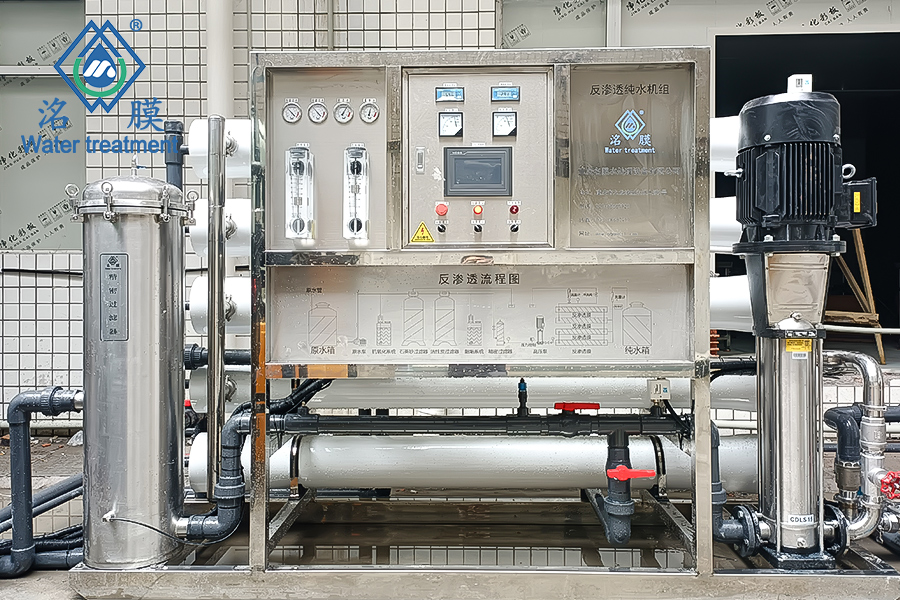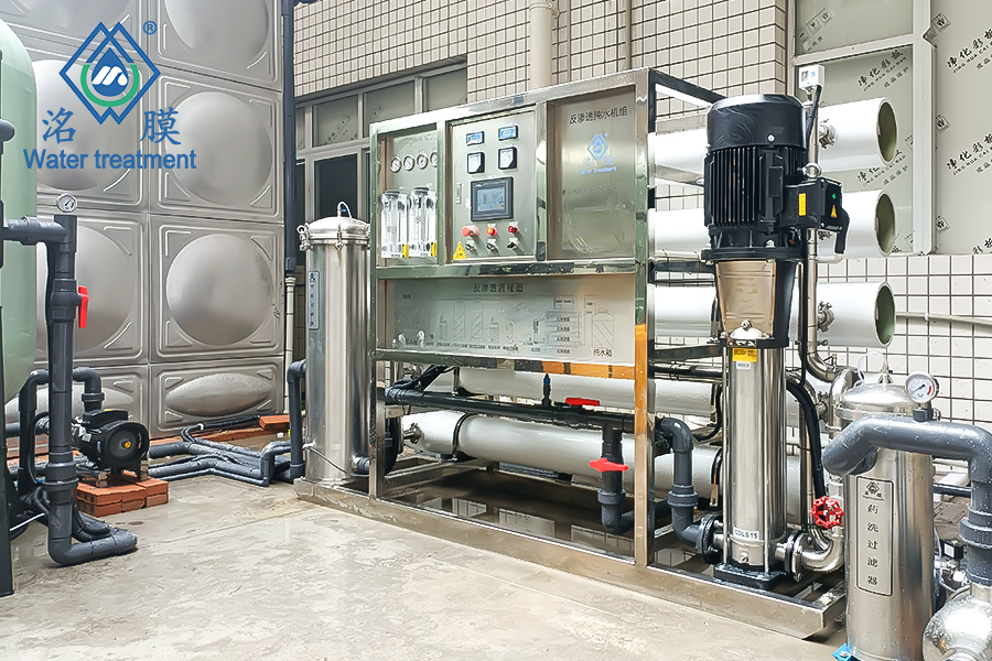 原水箱→抗氧化剂投加→介质过滤器→吸附过滤器→阻垢剂投加→精密过滤器→RO膜→出水